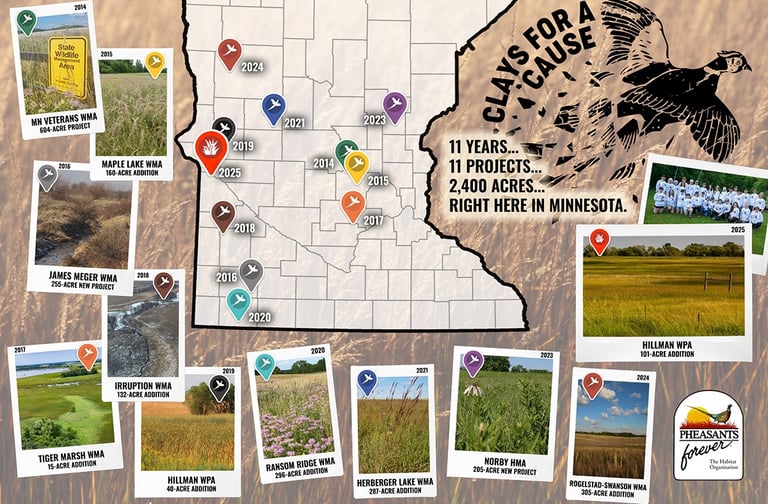 As dedicated shooters and hunters, we decided to organize Clays for a Cause, a fundraiser shoot, lunch and silent auction which raises money for the purchase and restoration of public hunting land. All raised proceeds go directly towards land in Minnesota—and we've been able to raise over $210,000 combined over our last eleven events, helping to create over 3,000 acres of permanently protected land.